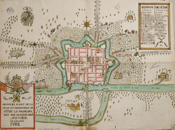 pièce 7 - Plan en couleurs de Vitry-le-François par Antoine Rémi Potier 1782, avec personnages travaillant dans les champs.