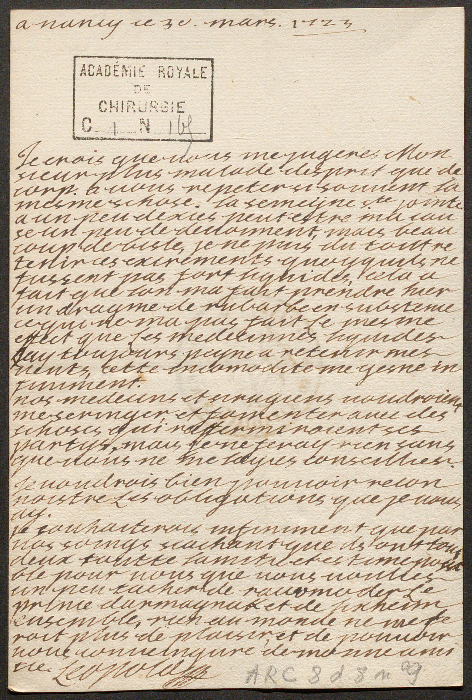 Le dossier consacré à la « maladie et mort de Léopold, duc de Lorraine » a été retenu, au cours de l’année universitaire 2024-2025, pour son ampleur limitée, la cohérence de l’ensemble et la diversité des questions abordées. Il apparaît assez inhabituel dans le fonds. Il ne s’agit ni du fonctionnement de l’Académie, ni d’une des nombreuses observations soumises à l’institution et dont les académiciens établissent un rapport. Il est composé essentiellement de lettres adressées par Léopold, duc de Lorraine (1679-1729) à La Peyronie (1678-1747) en 1722 et 1723, avant la création de l’Académie, et qui ont été conservées parmi ses papiers.